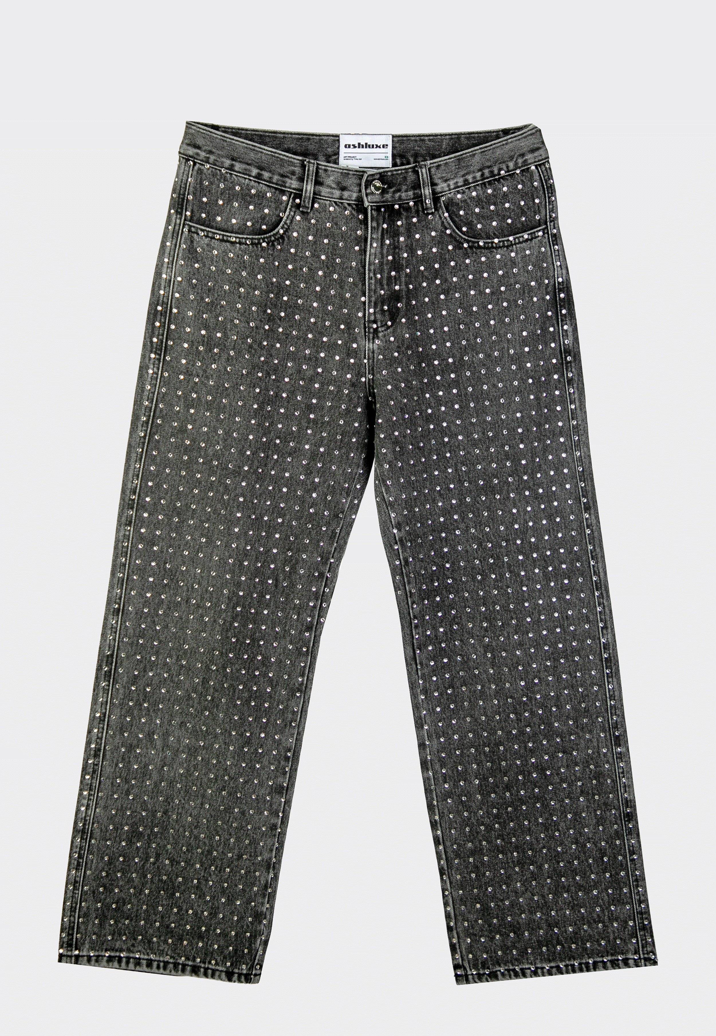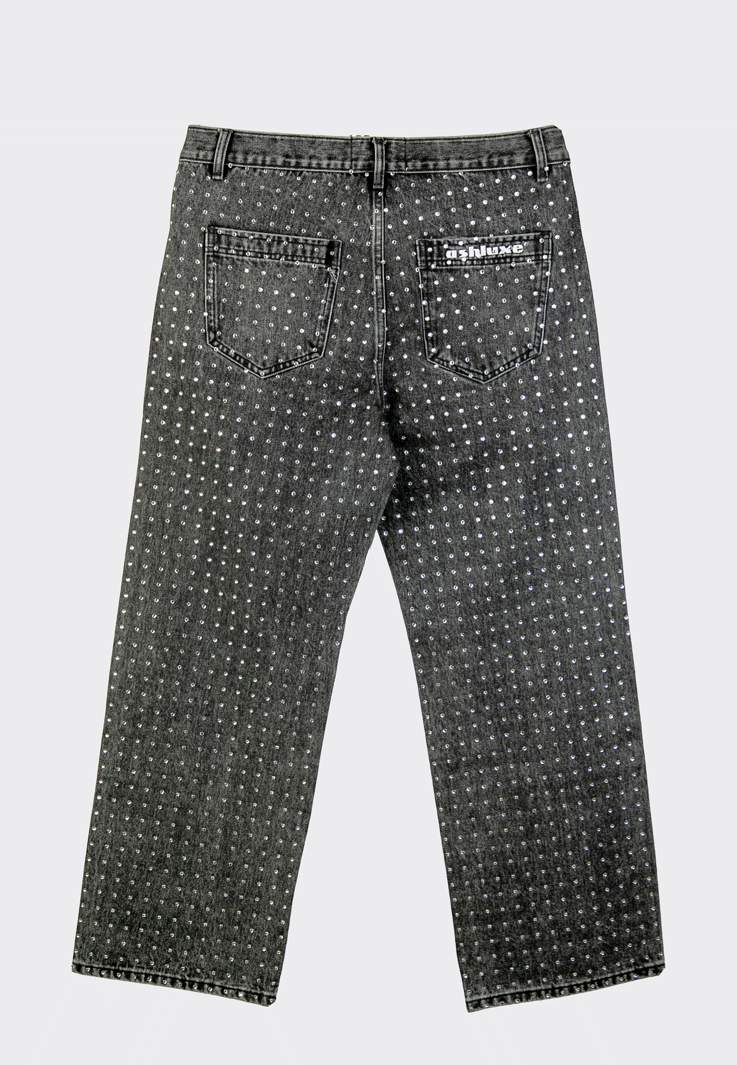 The Ashluxe Relaxed Rhinestone Denim Pant from the Manor II drop pairs perfectly with its studded shirt counterpart. Crafted from a premium denim blend, these pants feature subtle metallic stud detailing along the legs and a straight-leg silhouette, offering a refined streetwear statement. Designed for modern luxury wardrobes, they balance comfort, structure, and elevated craftsmanship.