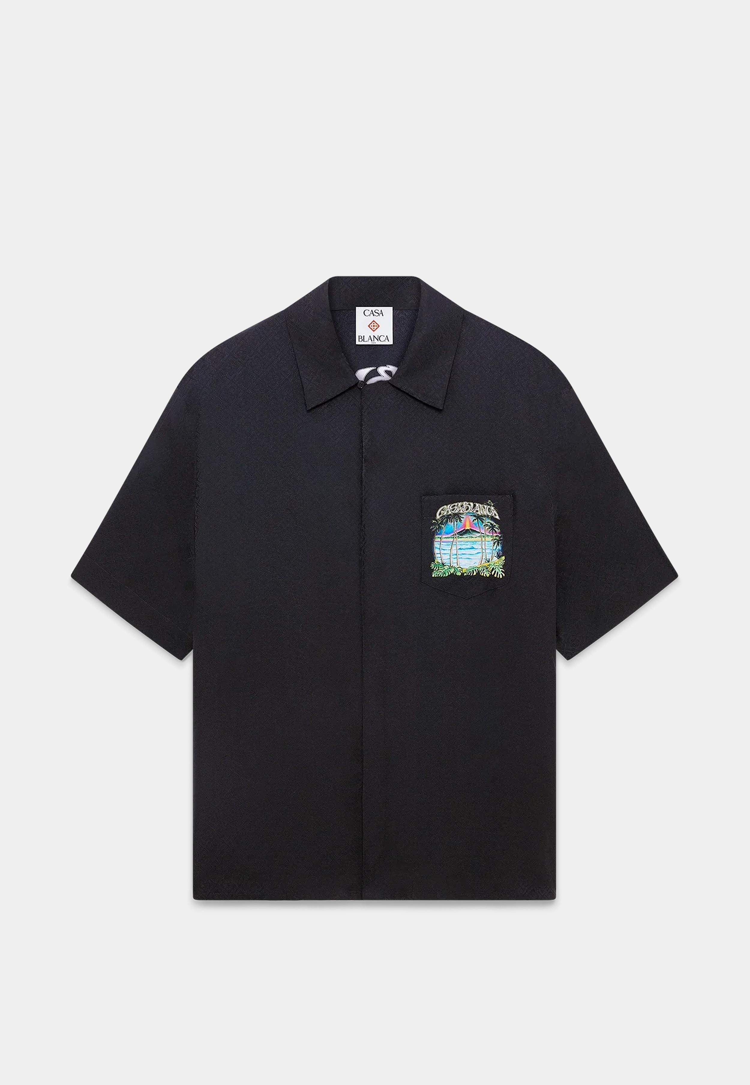 The silk shirt that makes black feel like the boldest choice in the room. Casablanca, founded in Paris in 2018, renders the Volcano print across 100% silk in a short-sleeve silhouette with a Cuban collar, hidden button closure with interlocking CC corozo buttons, and a breast pocket. Available now at Ashluxury, a designer clothing boutique carrying the full Casablanca silk shirt range. Wear open over a white tee or closed with matching Casablanca silk shorts.