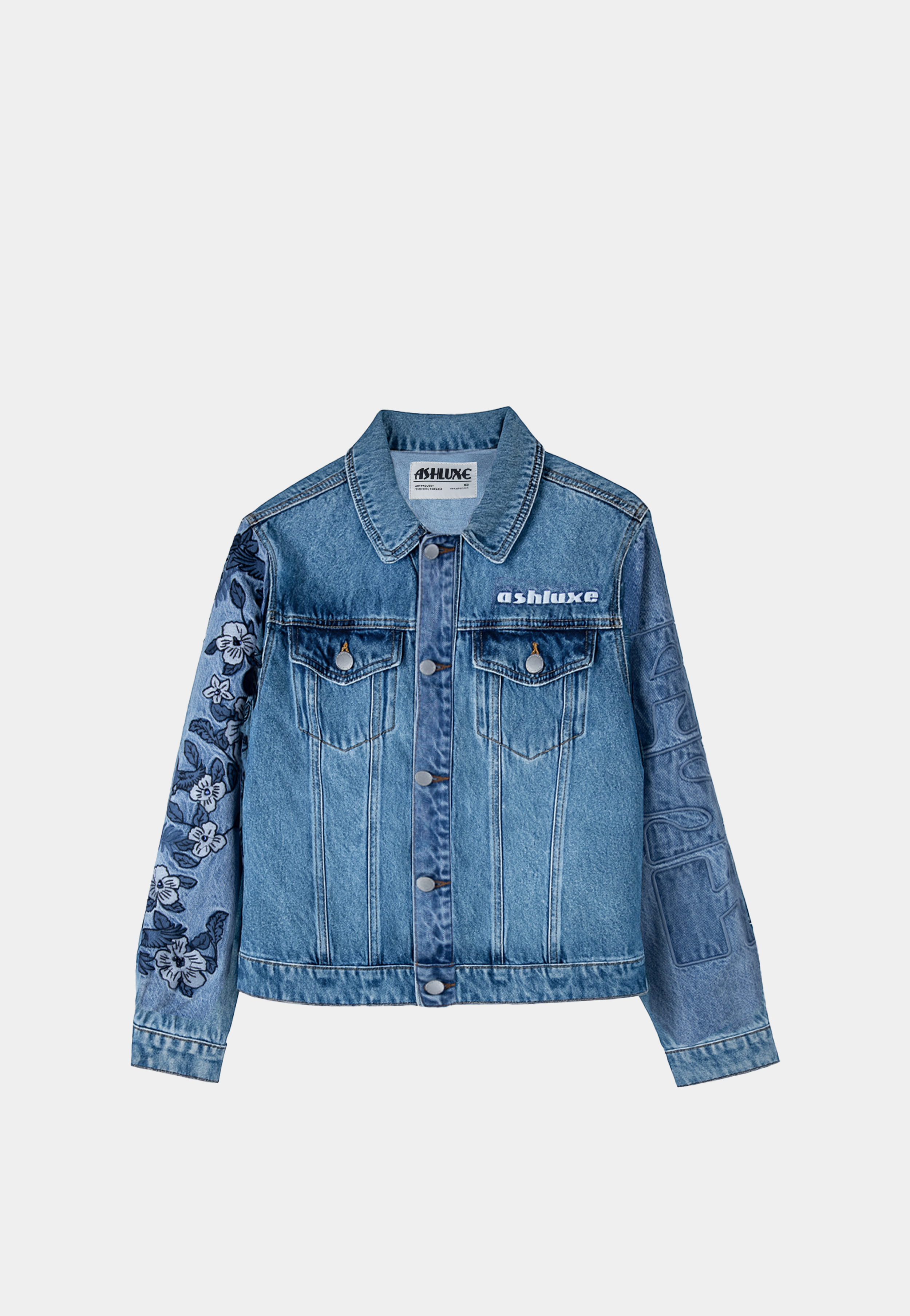 The Ashluxe Flowery Denim Pants Blue balance craftsmanship and expression. Cut from premium midweight denim, they’re enzyme-washed for a lived-in softness and structured drape. Tonal floral embroidery flows along the side leg, complemented by an oversized “ASH” applique that defines identity with subtle confidence — a perfect harmony of texture, artistry, and form.