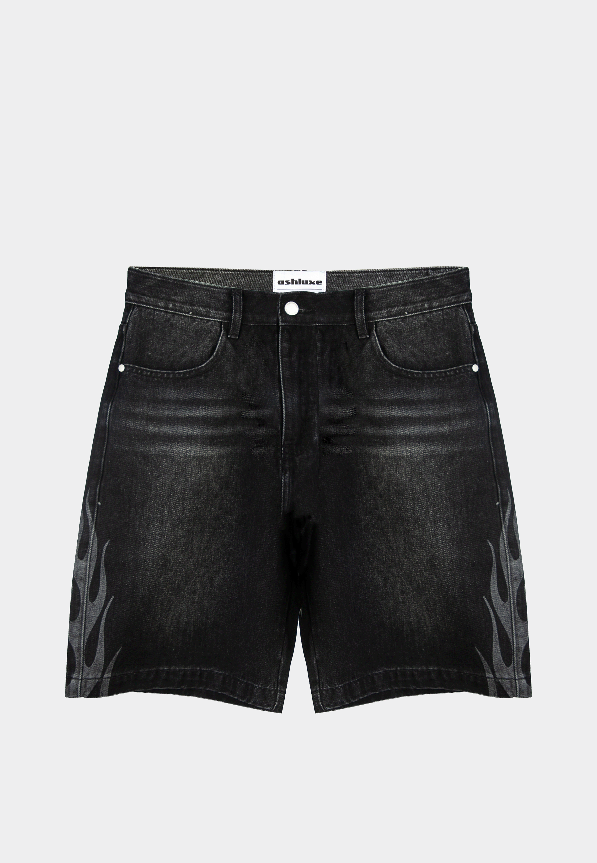 The Ashluxe Flame Denim Shorts from the Manor II drop combine street-inspired graphics with premium craftsmanship. Made from midweight stretch denim, these shorts feature a structured drape and flame-gradient artwork rising from the hem, creating a bold, elevated look. Designed for modern streetwear wardrobes, they blend comfort, detail, and luxury fashion aesthetics.
