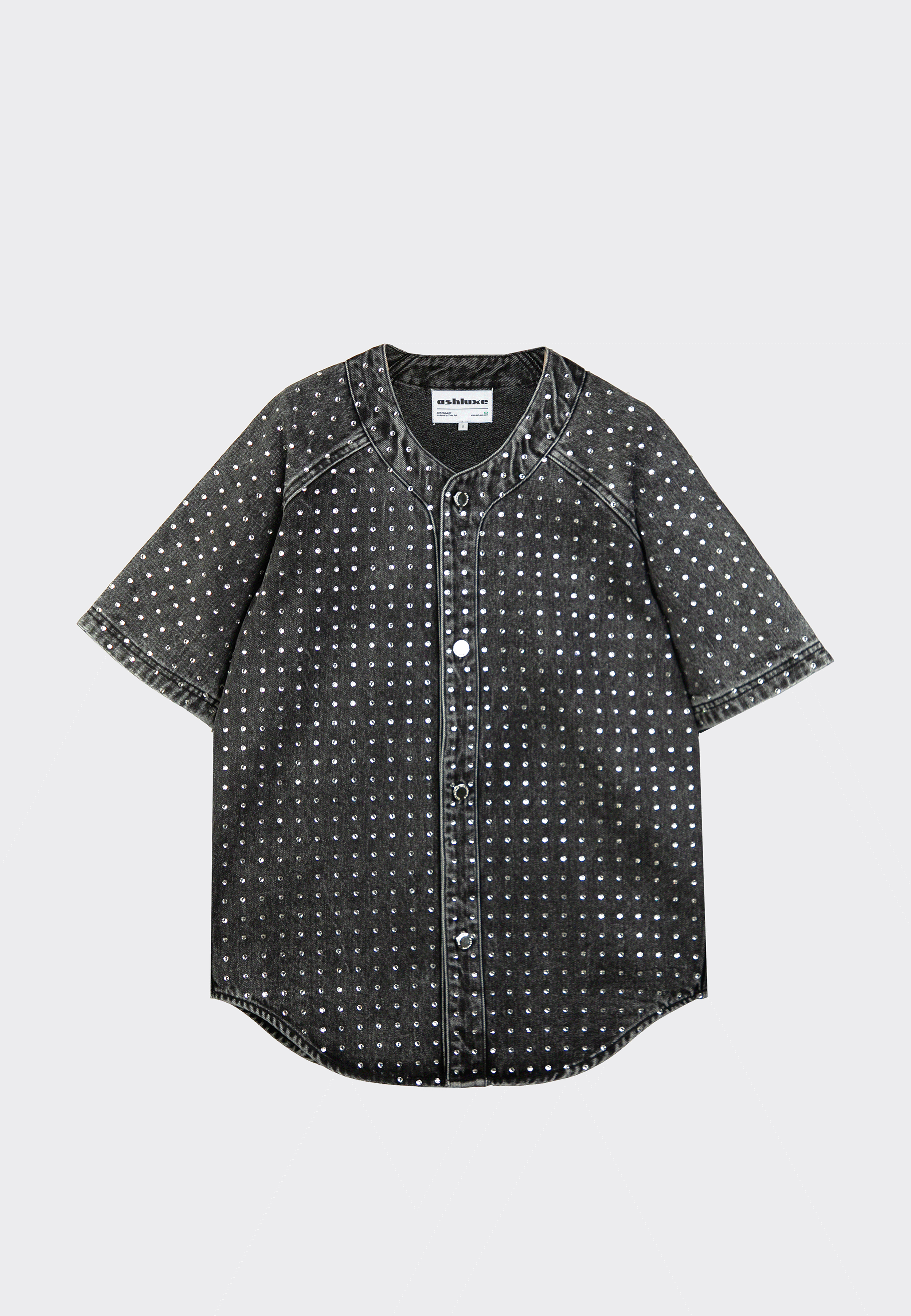 The Ashluxe Relaxed Rhinestone Denim Shirt from the Manor II drop elevates streetwear with subtle sparkle and premium construction. Crafted from a heavyweight denim blend, this shirt features all-over metallic stud embellishments and a relaxed boxy silhouette. Designed for modern luxury wardrobes, it combines casual ease with refined detail, perfect for versatile styling.